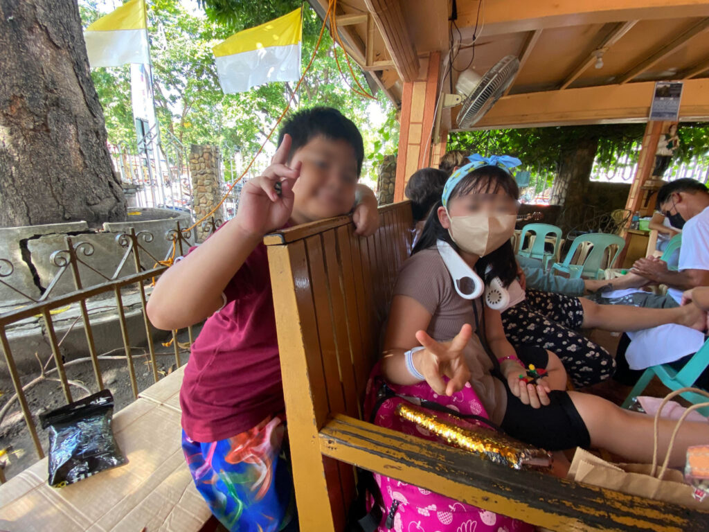 「到着が遅れて、出発案内が10分ぐらい遅れるというアナウンスだったよ。ま、たった10分ね。同じフライトだから声かけてあげるね!こちら私の主人で中国人なの。これからセブに行ってさらにマニラに行くのよ~。あなた日本人?子供と一緒なの?かわいいね!」